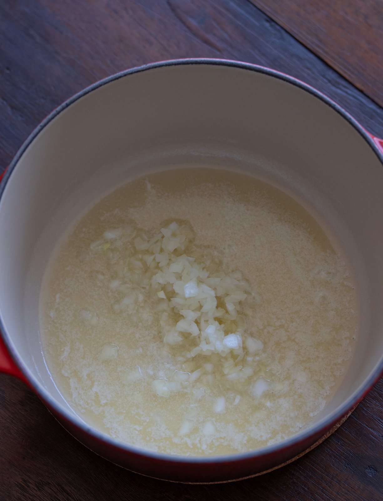 - Melt the butter in a small saucepan over medium heat. Mince the reserved onions and add to the butter.
