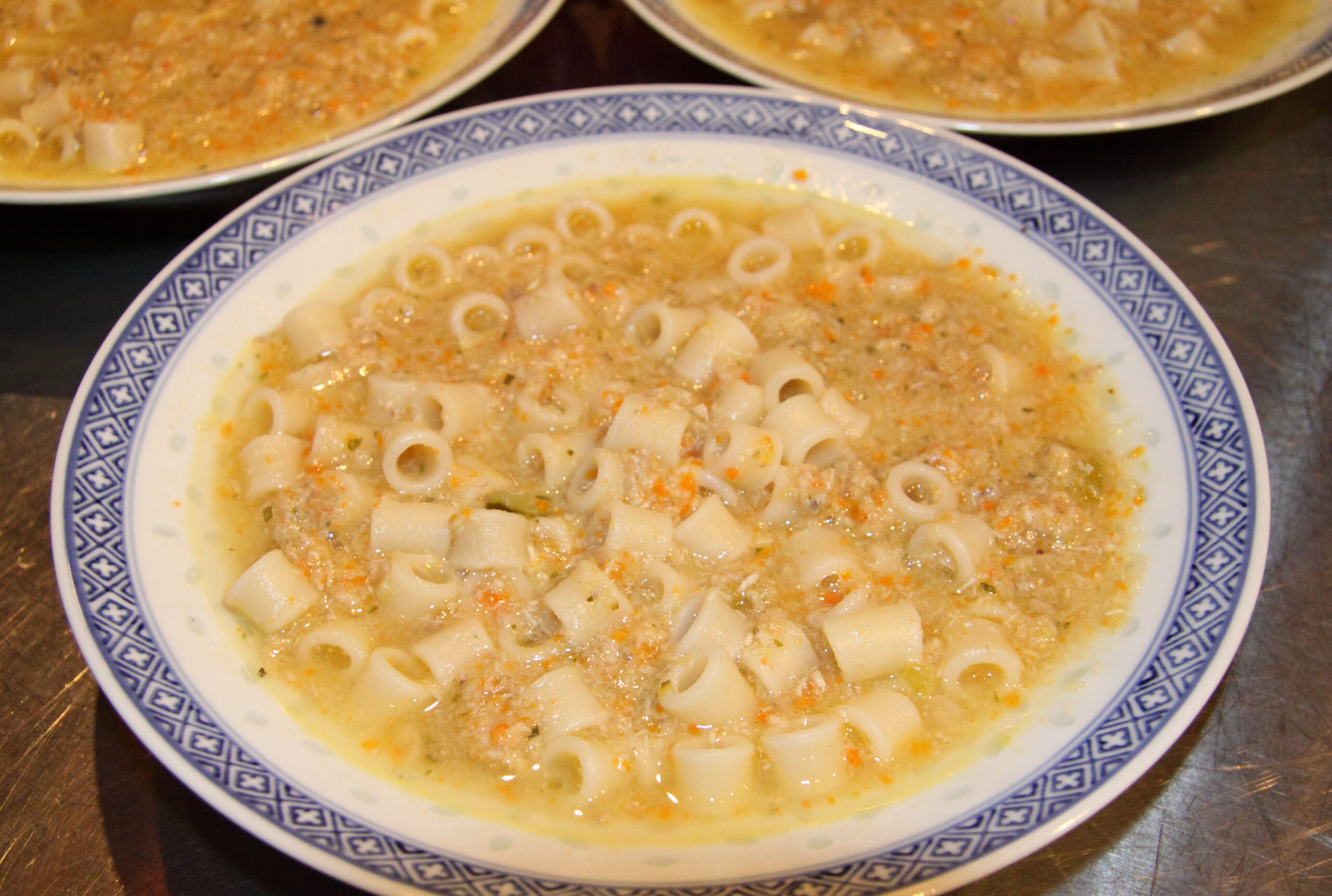 - At this point I cooked small rings (ditalini) egg pasta. When done I drain and place some of the pasta in a soup bowl and add the soup over it.