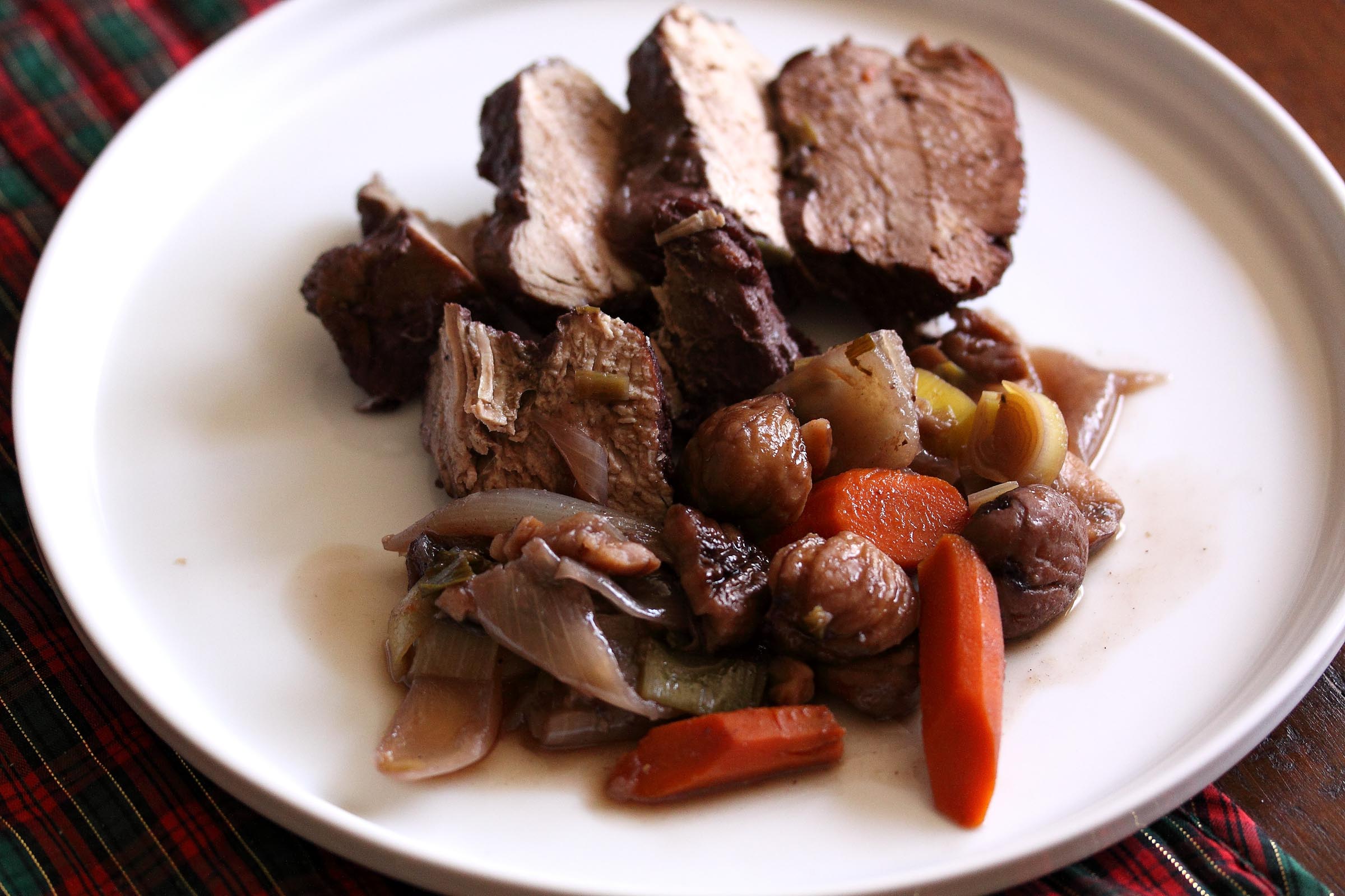 Tender pork tenderloin braised in red wine, vegetables and chestnuts. The perfect dish to welcome Fall and Winter. Rich in flavor and so savory, you will not be able to wait to enjoy it.