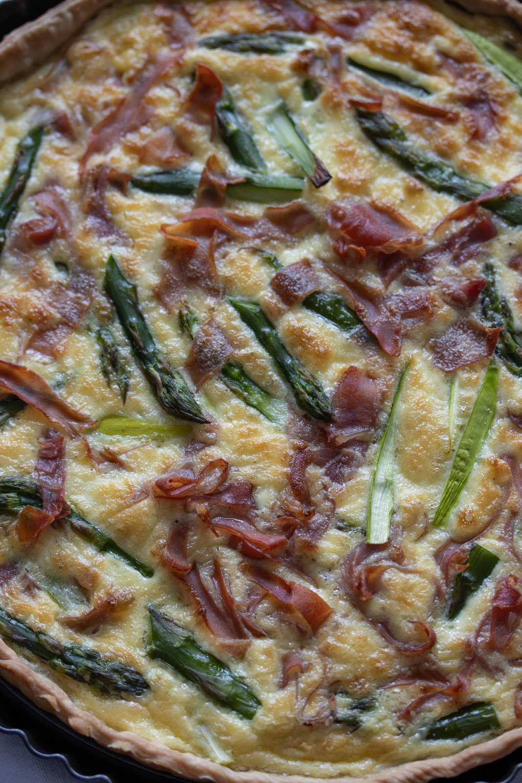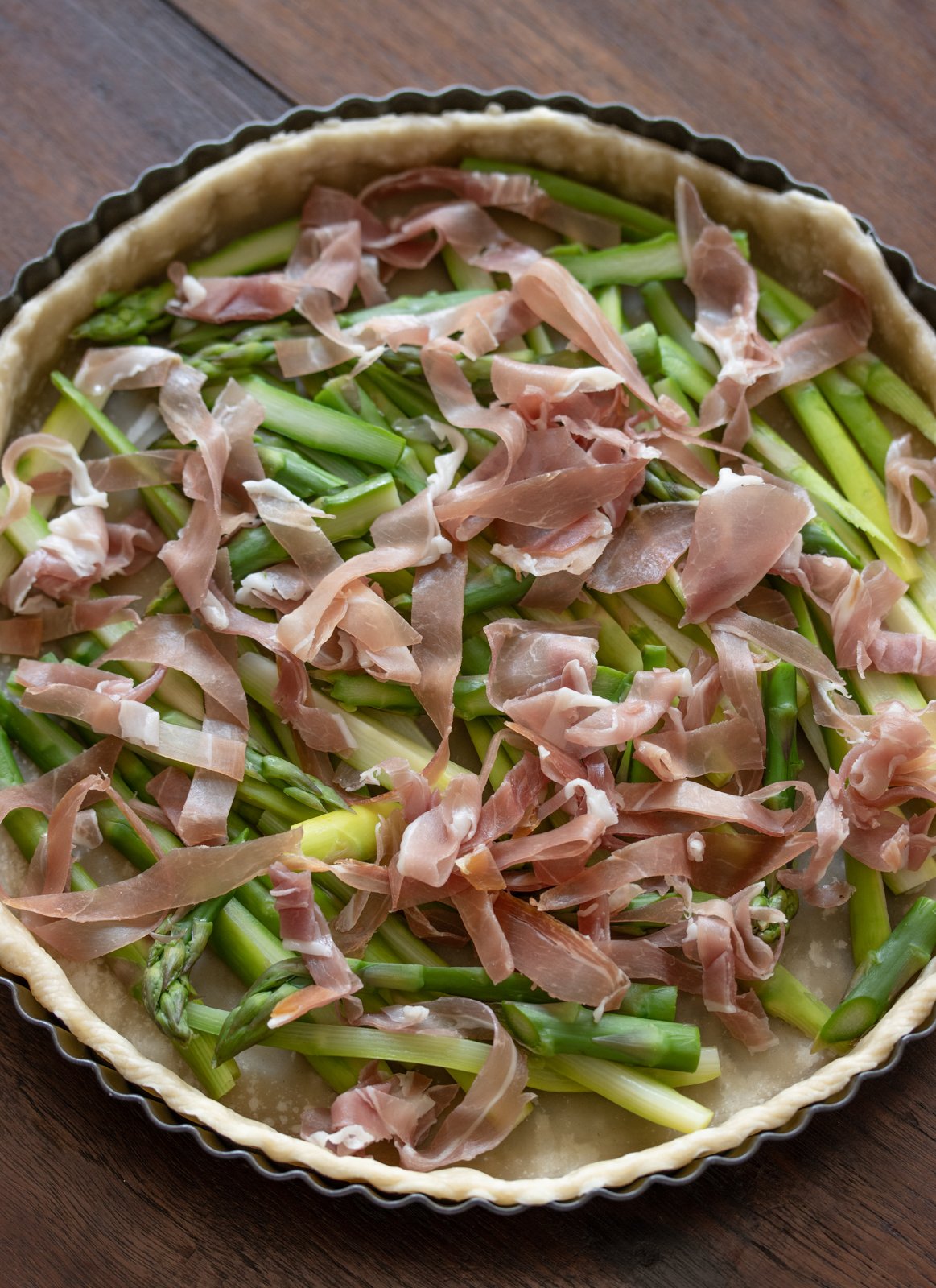 - Remove the pie weights and toss the parchment paper. Lay the asparagus strips and the ham on the bottom of the pie dough. Add the egg mixture. Bake for about 25 to 30 minutes, until your quiche has a golden top.