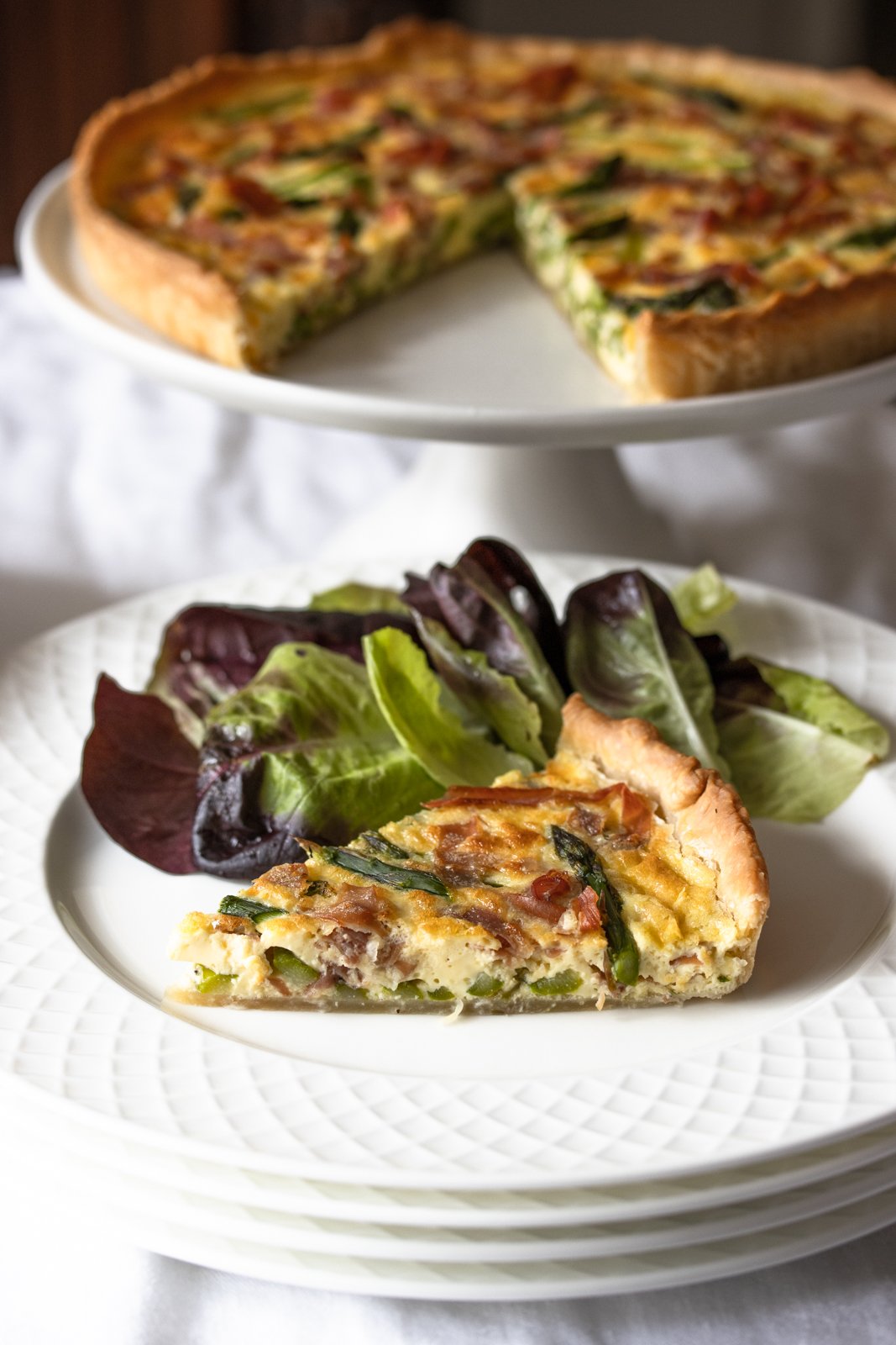 This asparagus quiche recipe is packed with fresh asparagus that are steamed, thinly sliced prosciutto with this light and delightful egg cream custard. Light in texture and rich in flavor, it is the perfect recipe for a Sunday brunch, a family dinner, or a party favorite dish.