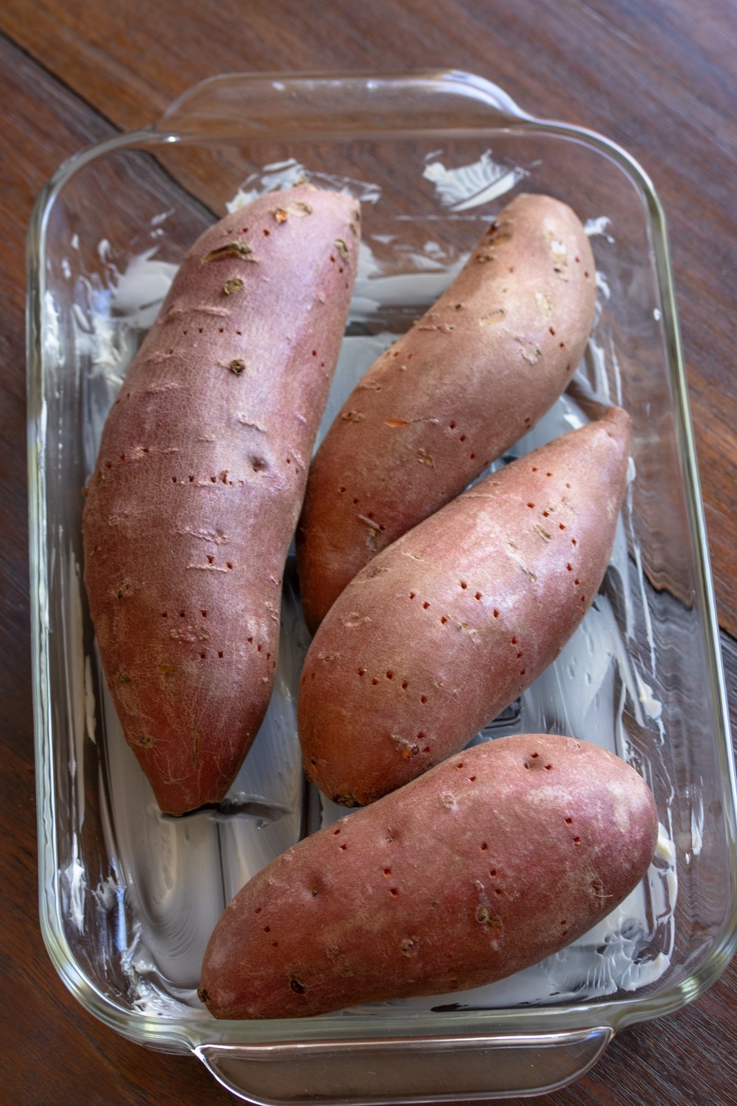 - Butter a glass baking dish big enough to hold all your sweet potatoes. Pierce each potato with a fork in several places. Place the potatoes in the baking dish and bake until very tender when pierced with a knife, about 1 hour. R