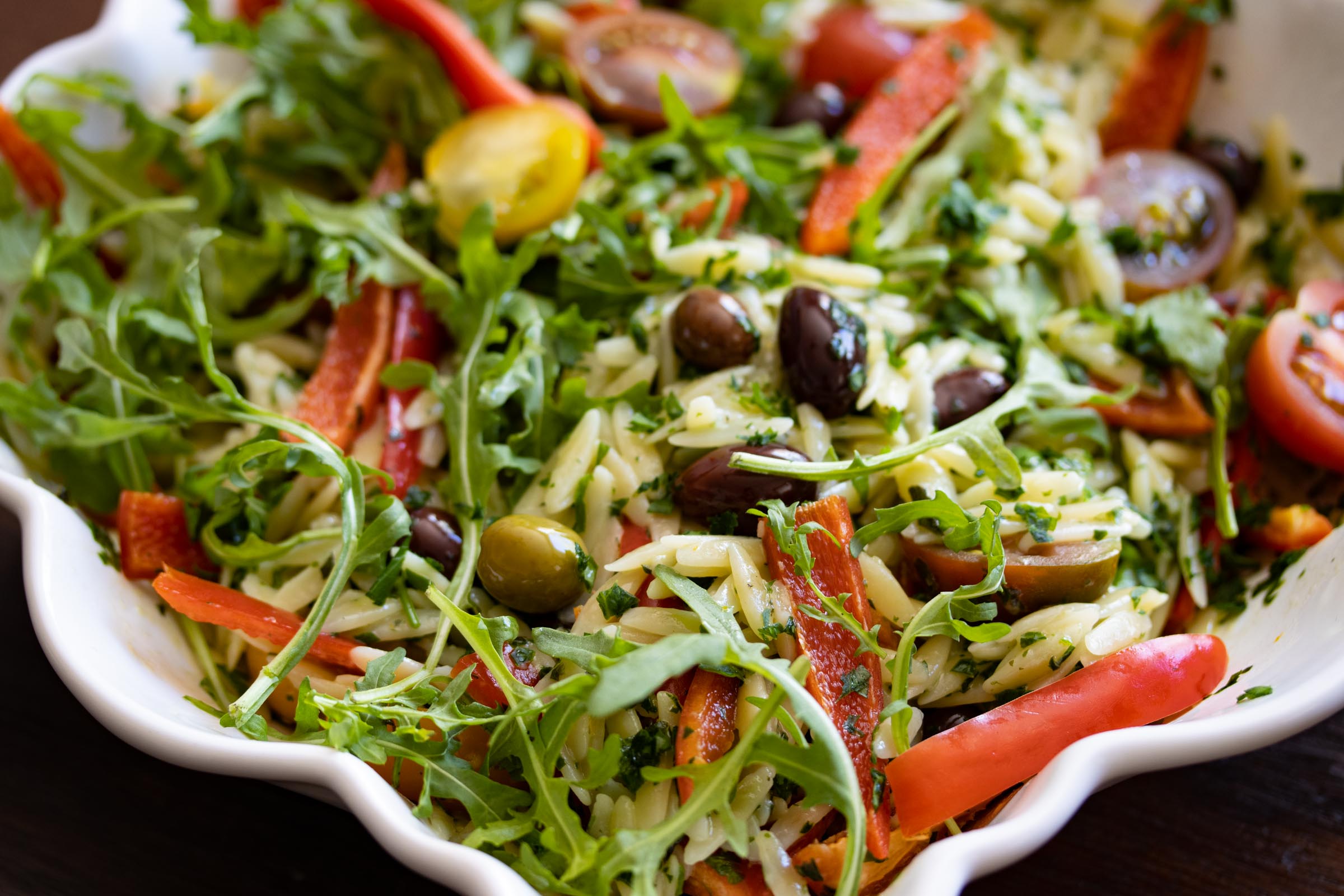 - Orzo Pasta Salad with Basil Butter, Peppers, Tomatoes