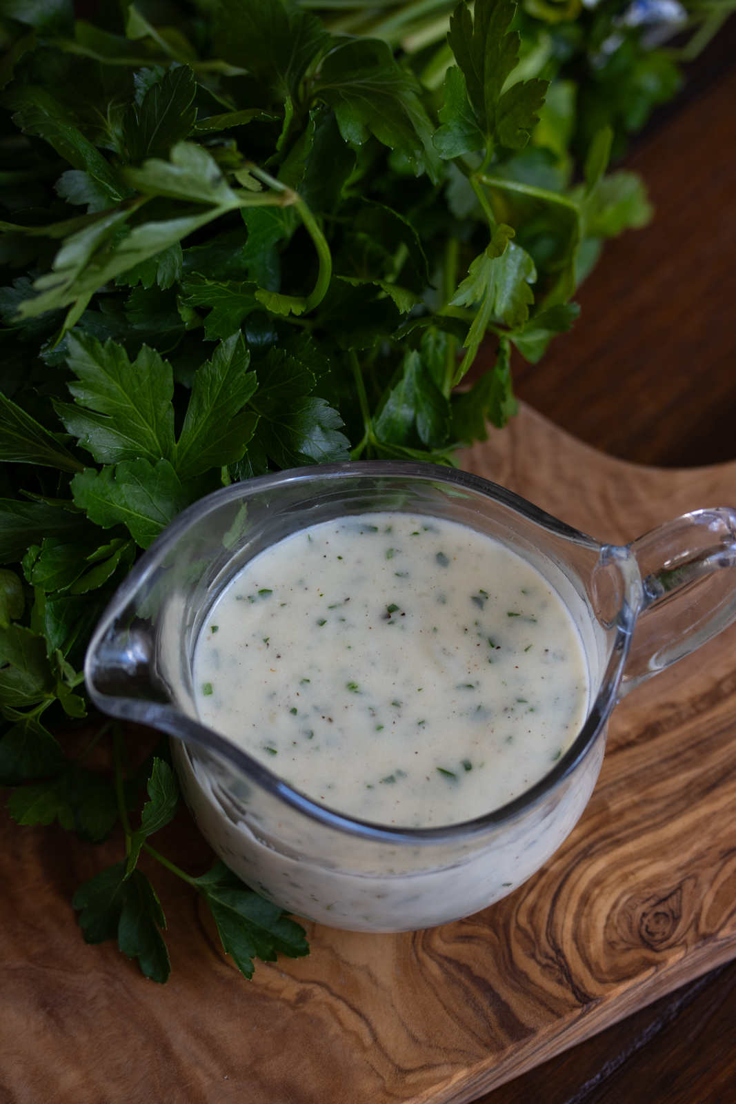 A rich white cream sauce with mustard, nutmeg, and parsley. The sauce can be enjoyed in so many ways over chicken, roasted vegetables, or as a dipping sauce.