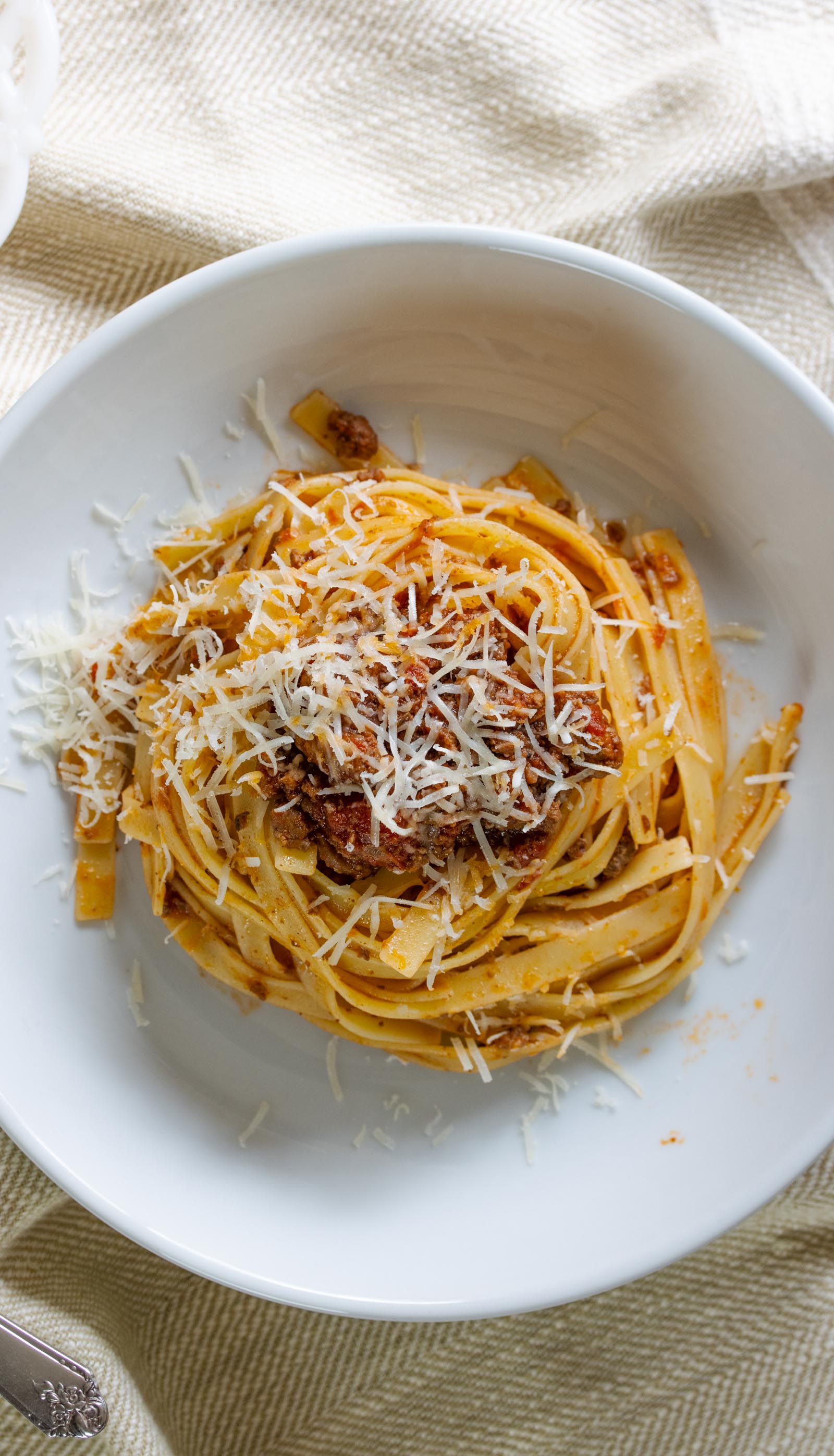 Serve your delicious Ragu Alla Bolognese over fettuccine pasta and grated cheese.
